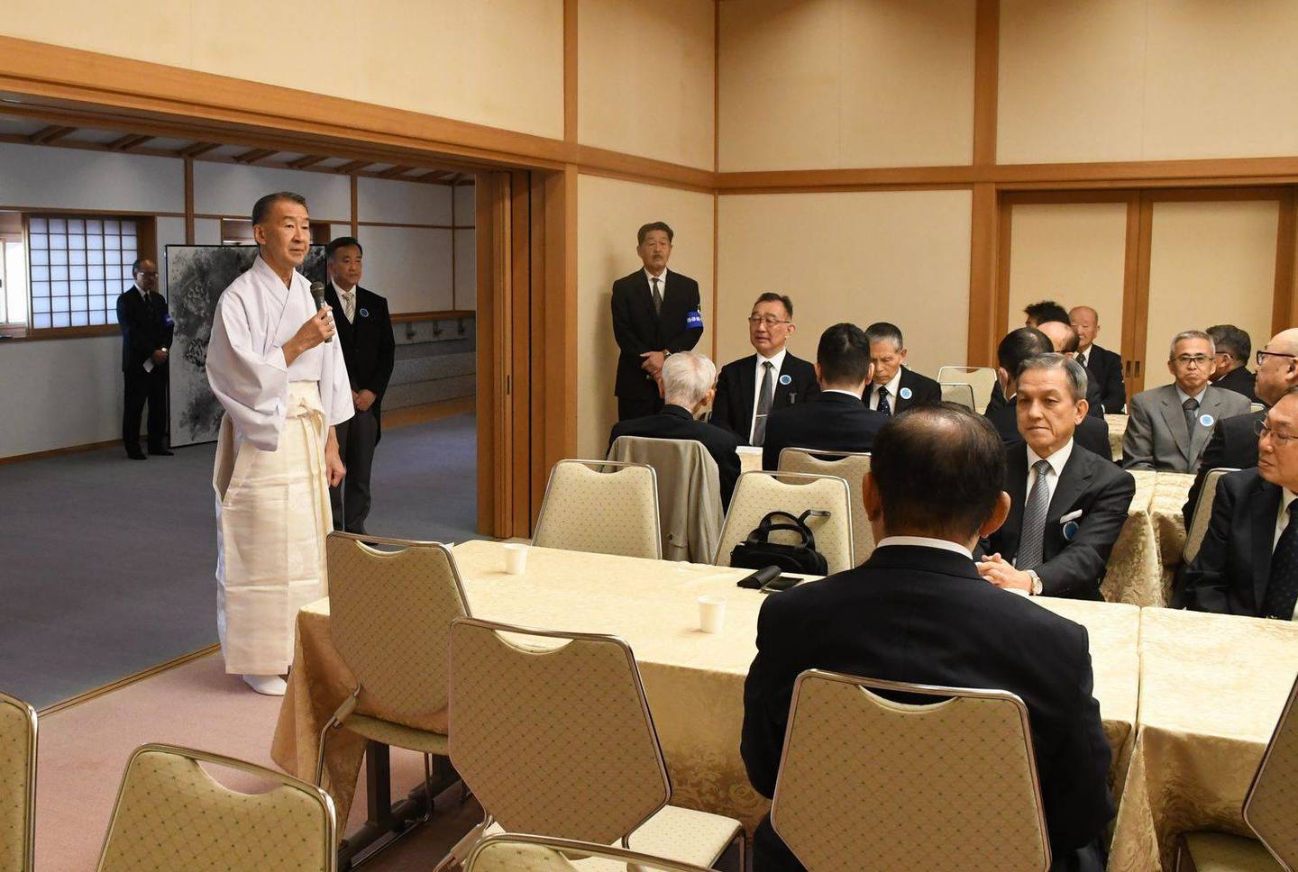 拝殿及び本殿における慰霊祭斎行後、靖國会館に移動し直会を実施しました。新宮司の大塚海夫様におかれましては、拝殿集合時のご挨拶に続き、 直会にもご参加頂き、冒頭にご挨拶を賜りますとともに、ご多用中にも拘わらず最後までお付き合いを頂き心から感謝・御礼申し上げます。