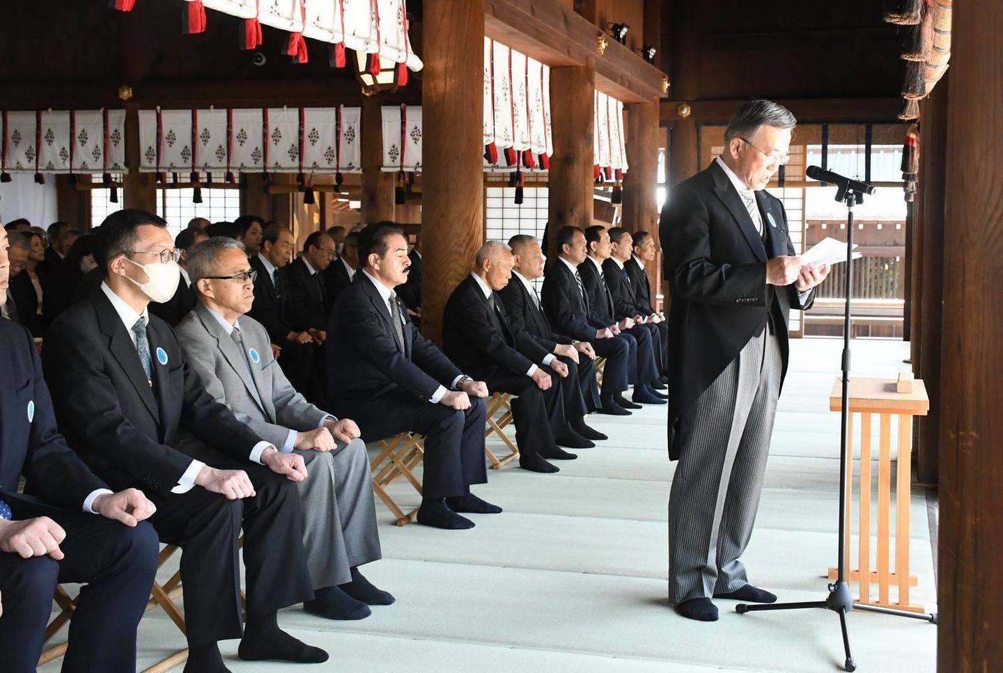 本日、四月十七日は、明治維新以降近代国家として発展する我が国が、国軍創設以来初めて国運を賭けて戦った対外戦争である日清戦争が、明治二十八年終結した日であります。 爾来、日露戦争、第一次世界大戦・満州事変・支那事変・大東亜戦争などの数次にわたる事変や戦争に際して「国家防衛のためにひたすら「国靖(やす)かれ」の一念のもと、陸・海軍将兵の数多くの方々が、祖国の国体の護持と繁栄、そして安寧を希い、陸に海に、そして空に於いて勇戦敢闘し、祖国のために殉じて逝かれ、また軍人の他にひめゆり部隊、従軍看護婦、樺太真岡の電話交換手など軍属・文官・民間の多数の方々が勤労動員中に尊い命を落とされました。 愛する家族を故国に残し、北は酷寒不毛、南は酷暑瘴癘(しょうれい)の異国の地、あるいは海洋で敢然と散って逝かれた方々、及び日本国の勝利を信じ不眠不休の勤労動員中に亡くなられた方々の無念さと、後に残されたご遺族の方々の深い悲しみに思いを致すとき、今なお万感胸に迫るものがあります。